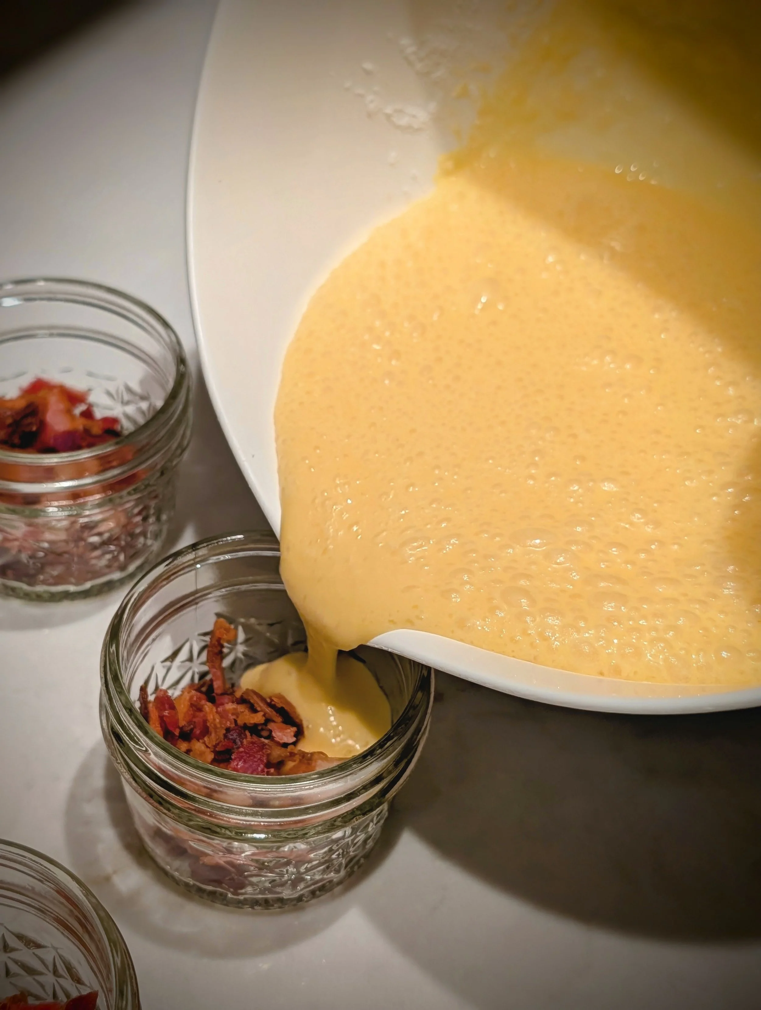 Fill six 4oz ball jars with your bacon pieces, equally distributing the bacon between them.
